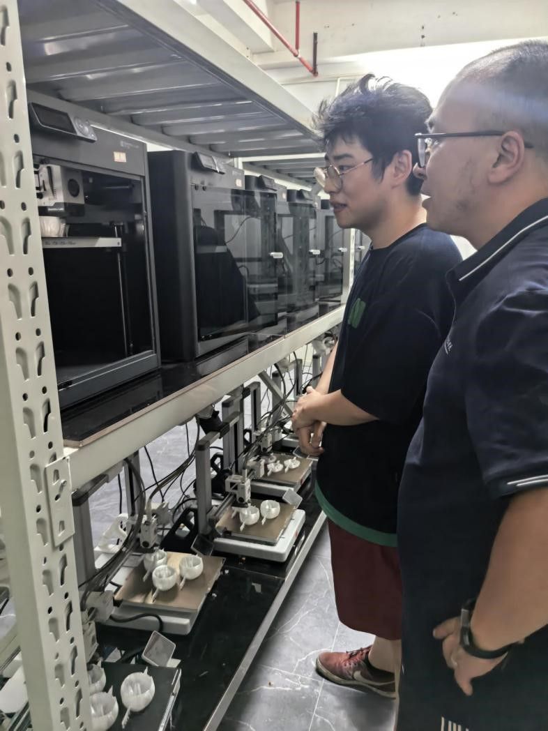 图4 白犀科技有限公司总经理王书意陪同考察正在生产加工订单的增材智造生产线