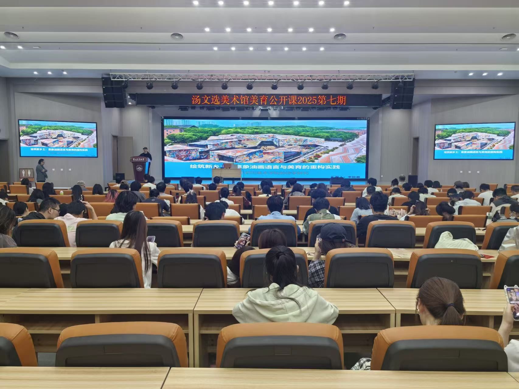 2025年9月18日下午16时至18时,湖北工程学院汤文选美术馆在一楼学术报告厅成功举办第七期美育公开课。本次活动由汤文选美术馆、湖北工程学院人事处、美术与设计学院、汤文选艺术研究中心及湖北工程学院美育中心联合主办。主题为“绘筑新乡土——基于四川美术学院的访学交流汇报”,由湖北工程学院副教授、湖北省美术家协会会员、四川美术学院访问学者李松林担任主讲。公开课由汤文选美术馆副馆长李波主持,美术与设计学院院长兼美术馆馆长杨剑君、美术学系教师及校内外学术听众两百余人聆听了此次讲座。
