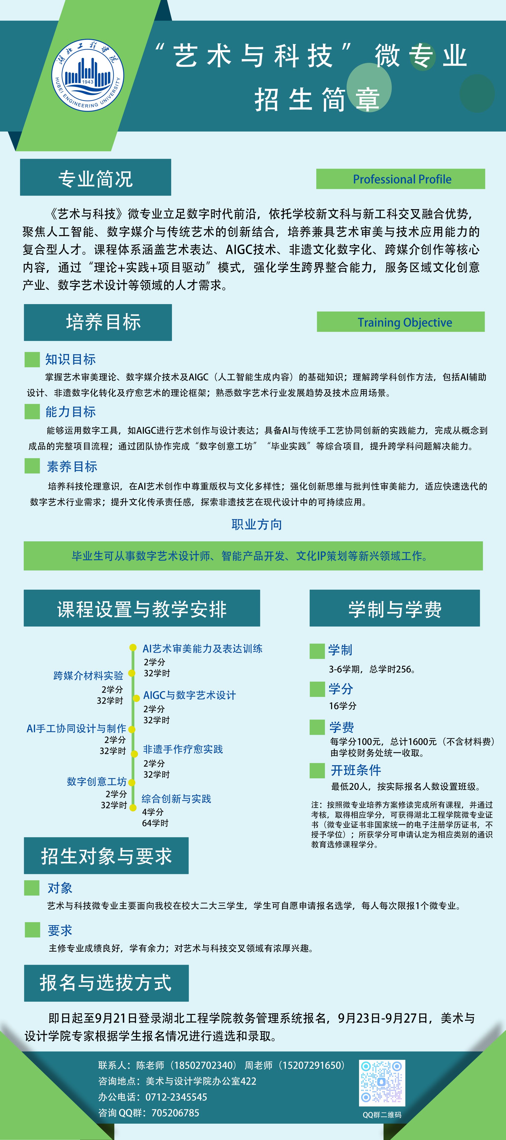 艺术与科技微专业学制为二年。按照微专业培养方案修读完成所有课程,并通过考核,取得相应学分,可获得湖北工程学院微专业证书(微专业证书非国家统一的电子注册学历证书,不授予学位);所获学分可申请认定为相应类别的通识教育选修课程学分。