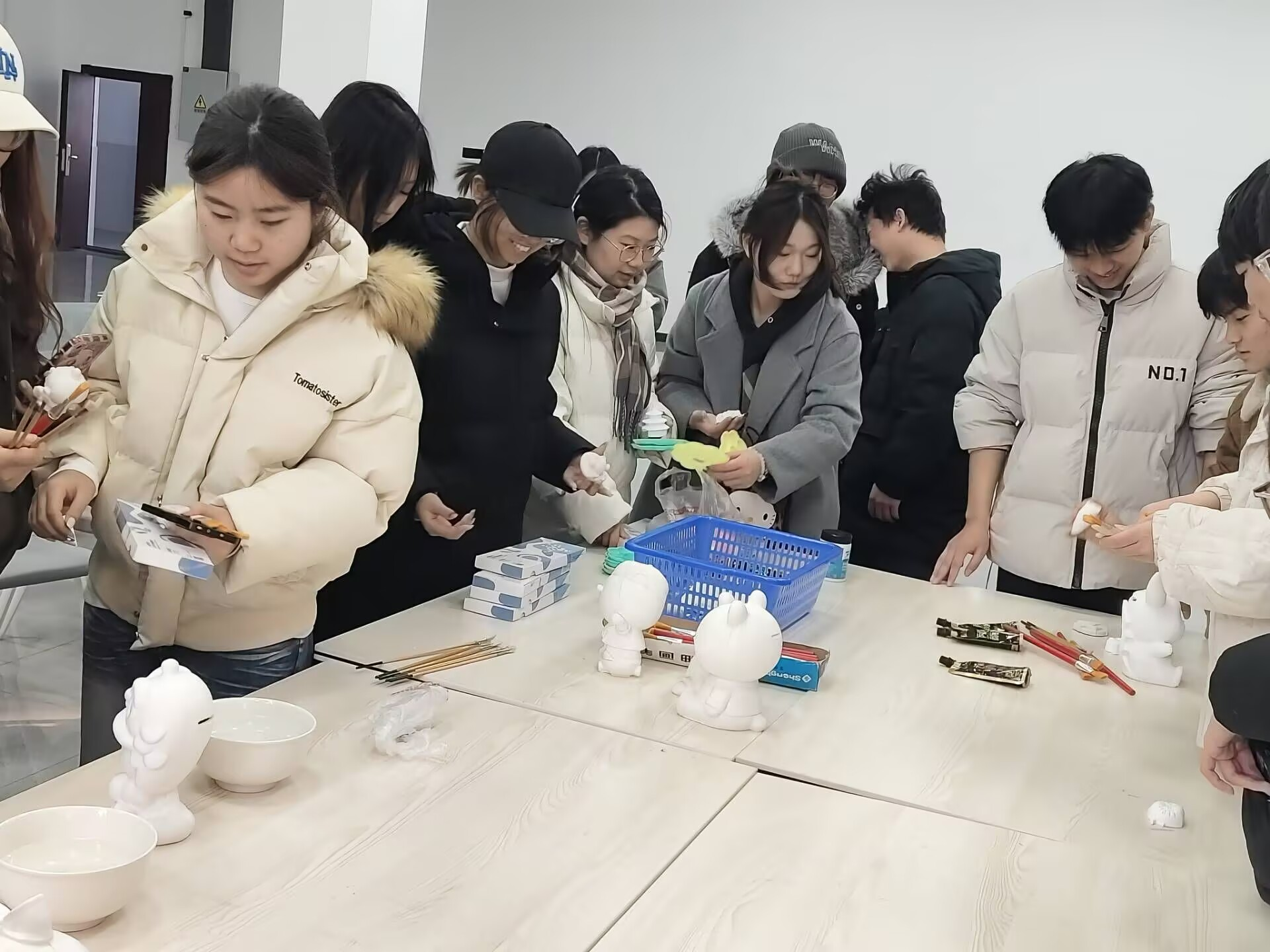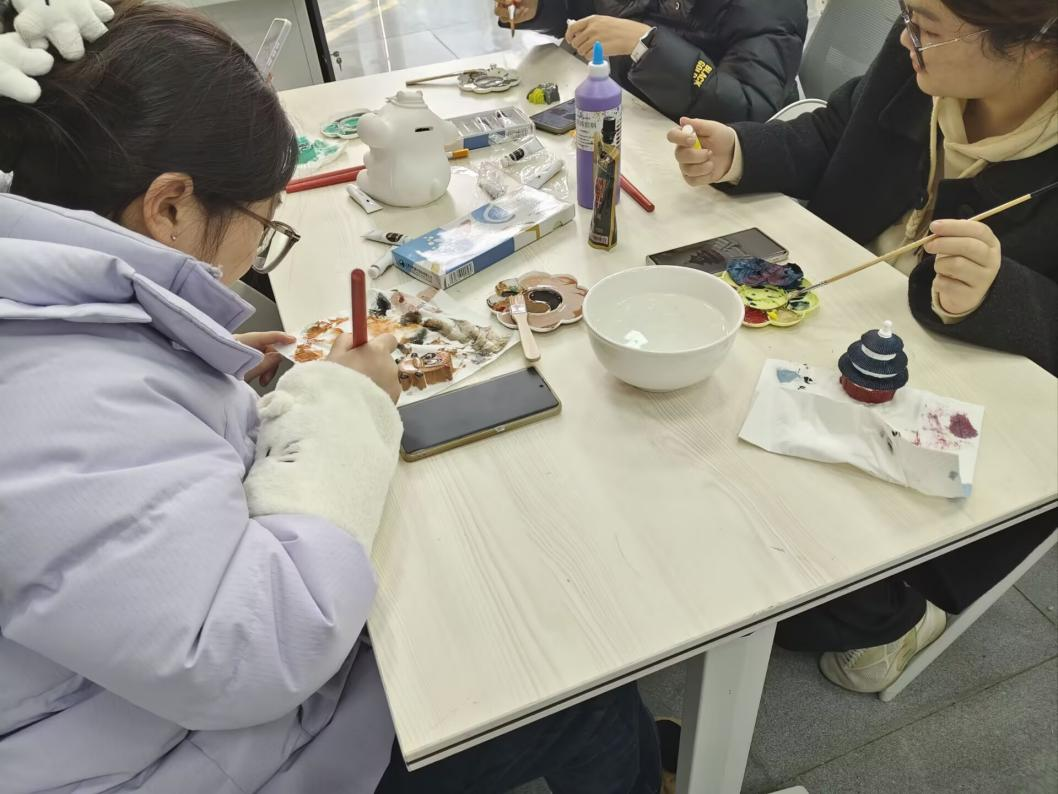 活动现场,同学们自由选择石膏坯体,调色绘画。创作过程中,大家专注于手中的画笔与色彩,全身心投入艺术创作,在创作的过程中感到平静与满足。同学们一边创作,一边自然地交流各自的想法和感受,现场氛围轻松融洽。这种基于共同兴趣的互动,既激发了创意,也让大家在交流中感受到了彼此的支持。