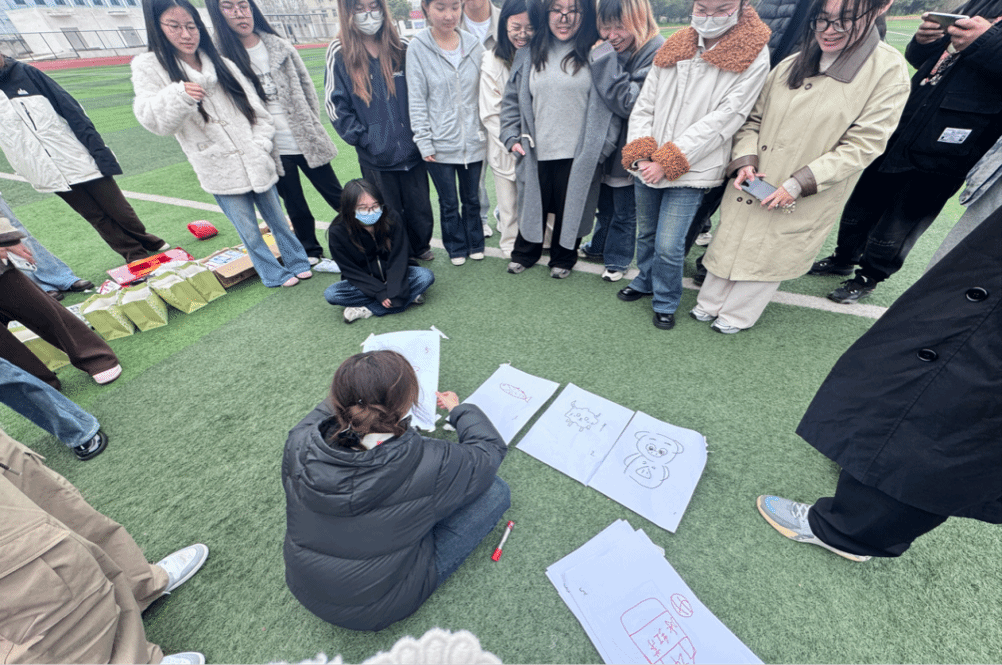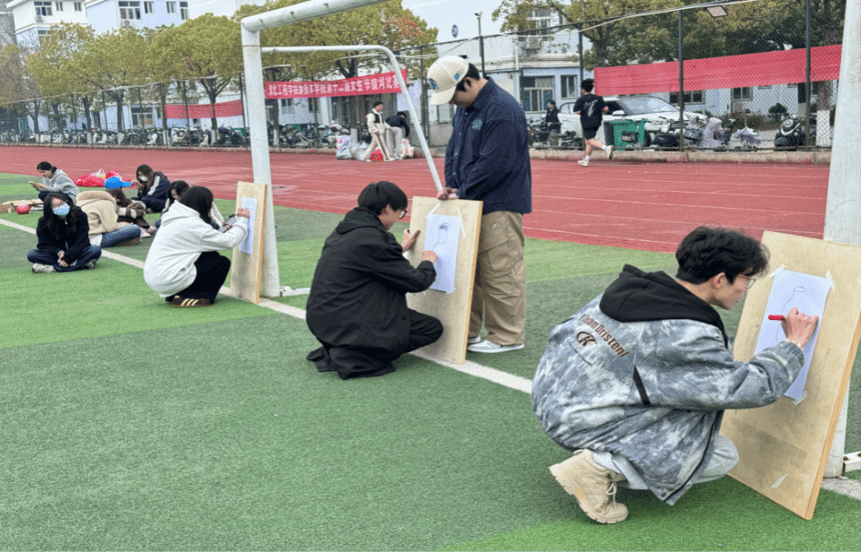 活动现场氛围热烈,参赛学子热情高涨。在彩韵接力中,队员们接力奔跑作画,兼顾速度与绘画还原度,以竞速、绘画双得分核算成绩,既考验身体协调性,更锤炼团队配合力;在绘心共鸣中,大家在无声创作中放松身心、舒缓情绪,用画笔实现心灵共鸣,欢声笑语不断;在同心绘中,同学们绑腿挽臂协同前行,尽显信任与默契,结合速绘双评分,增强大家的集体归属感。