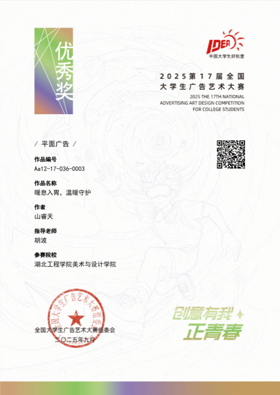 湖北工程学院美术与设计学院在本届比赛中表现突出,由胡波老师指导的山睿天同学设计的《暖息入胃,温暖守护》作品和刘欣、张怡欣同学设计的《咬出你的超能力》作品,以及由李泉老师指导的易思亮同学设计的作品《这样一袋 装得下所有热爱》,共3件优秀作品成功入选全国总决赛,展现了我院在广告创意与设计教育方面的扎实基础和创新能力。