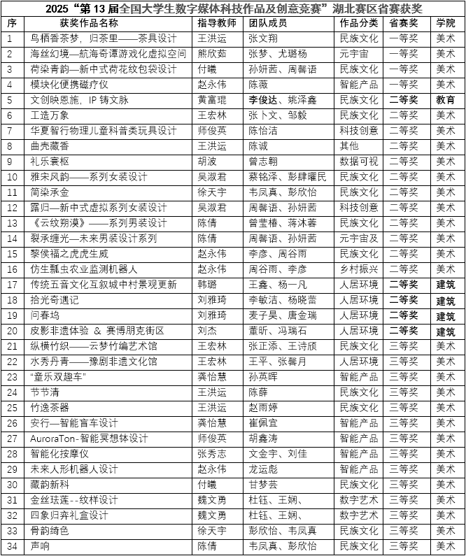 近日,2025年“第13届全国大学生数字媒体科技作品及创意竞赛”湖北赛区省赛评比结果公示结束,我校学子取得优异成绩,共获一二三等奖52项;其中,美术与设计学院获奖41项(一等奖4项、二等奖11项、三等奖26项)、建筑学院7项(其中,二等奖3项、三等奖4项)、机械工程学院1项、教育与心理学院1项、文学与新闻传播学院1项、生命科学技术学院1项。