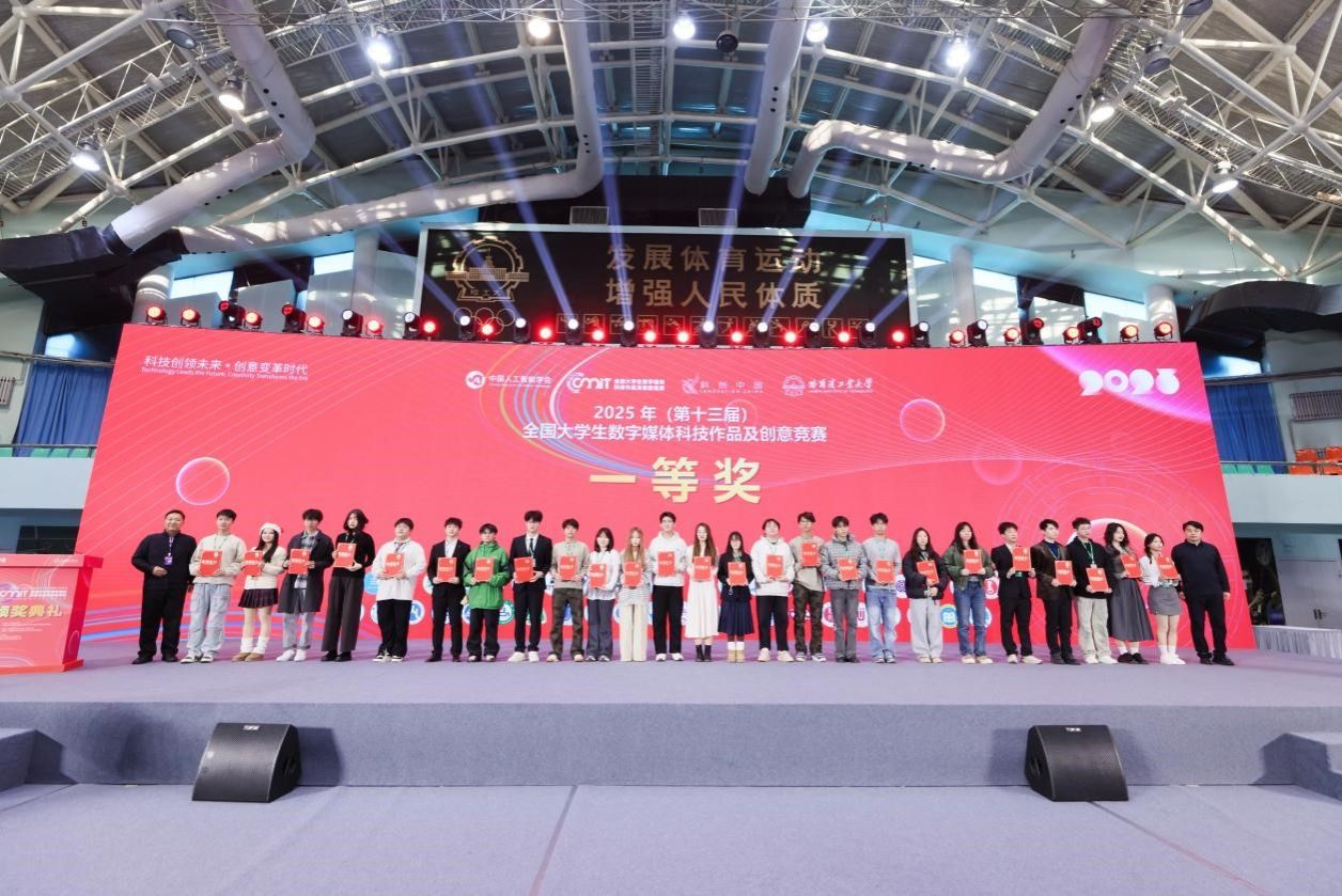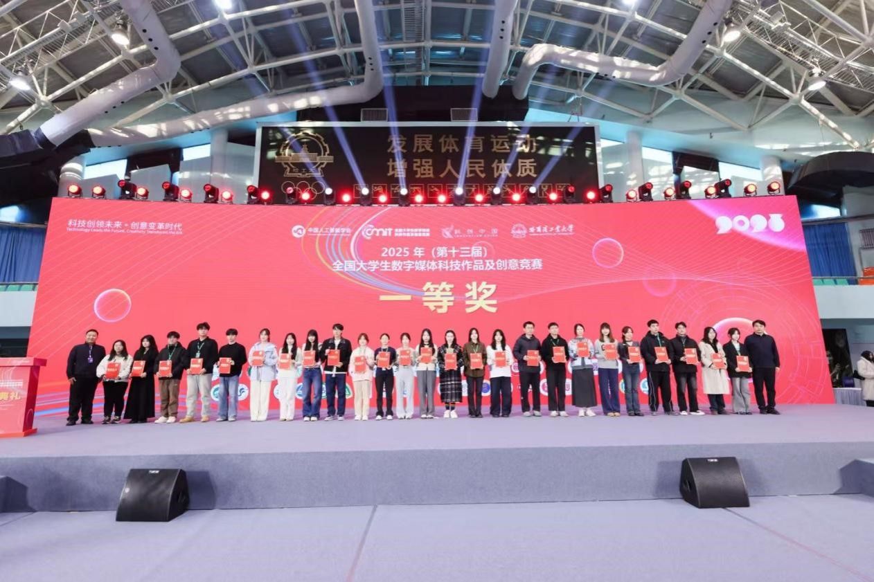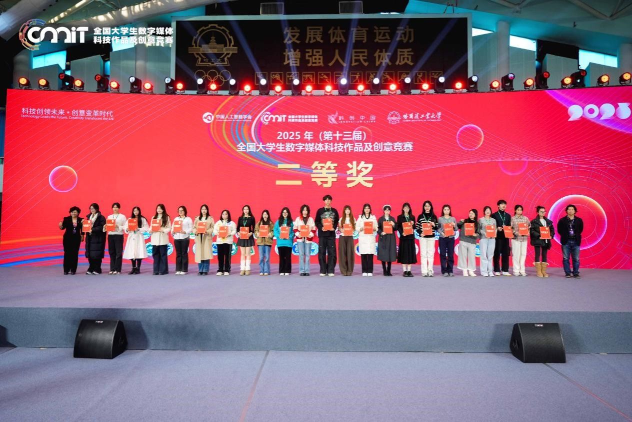 2025.10.24—10.26日,第十三届“全国大学生数字媒体科技作品及创意竞赛”全国总决赛在哈尔滨工业大学完美收官,经过现场角逐,我校学子共获得国赛一二三等奖20项的好成绩:美术与设计学院获奖15项(其中,一等奖2项、二等奖2项、三等奖11项)、建筑学院获三等奖4项、教育与心理学院获三等奖1项。现场决赛获得国赛一二等奖的10位美院学生参加颁奖典礼并上台领奖;另外,我校美术与设计学院王洪运、陈军、熊欣茹三位国赛一等奖指导教师荣获“优秀指导教师”荣誉称号。