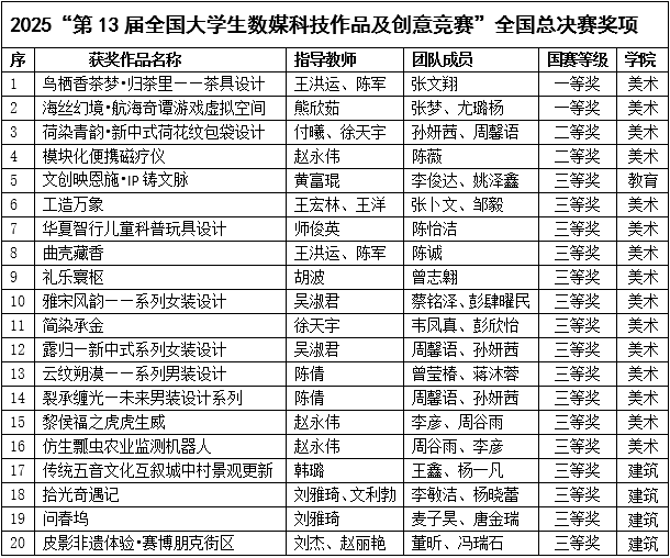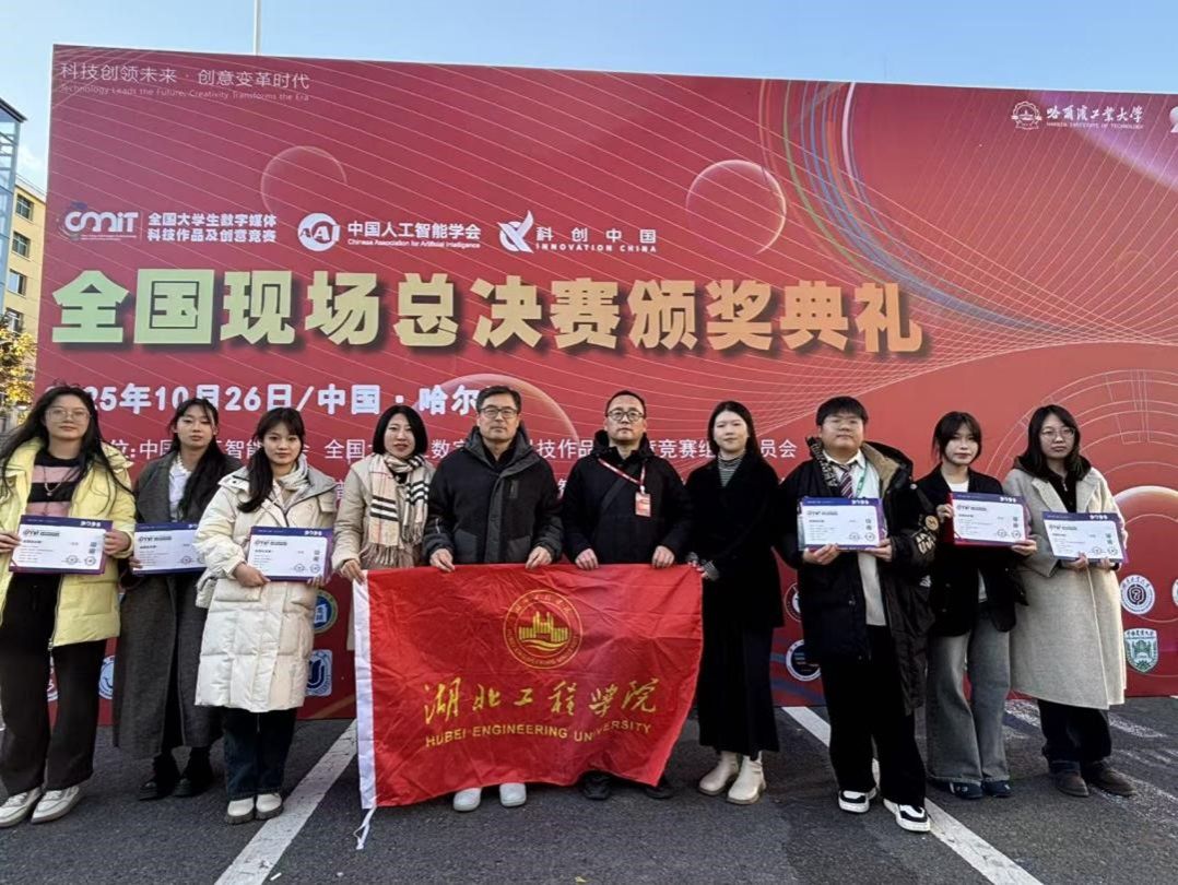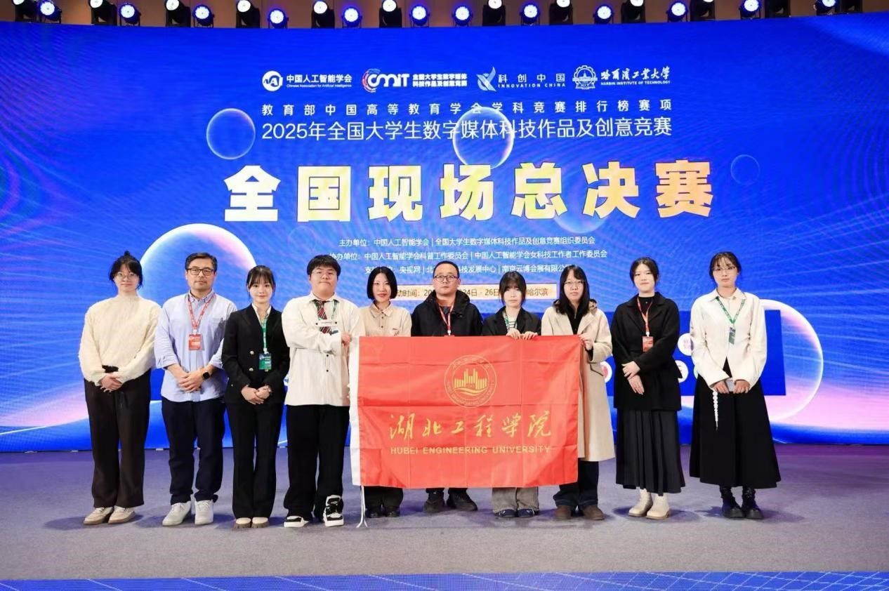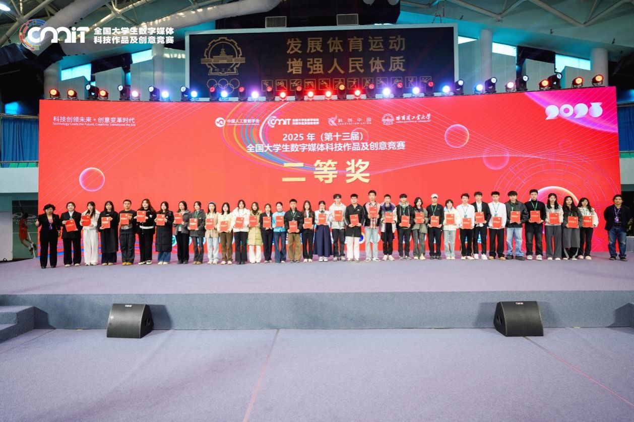 2025.10.24—10.26日,第十三届“全国大学生数字媒体科技作品及创意竞赛”全国总决赛在哈尔滨工业大学完美收官,经过现场角逐,我校学子共获得国赛一二三等奖20项的好成绩:美术与设计学院获奖15项(其中,一等奖2项、二等奖2项、三等奖11项)、建筑学院获三等奖4项、教育与心理学院获三等奖1项。现场决赛获得国赛一二等奖的10位美院学生参加颁奖典礼并上台领奖;另外,我校美术与设计学院王洪运、陈军、熊欣茹三位国赛一等奖指导教师荣获“优秀指导教师”荣誉称号。
