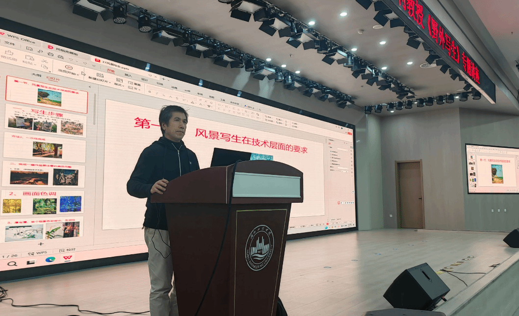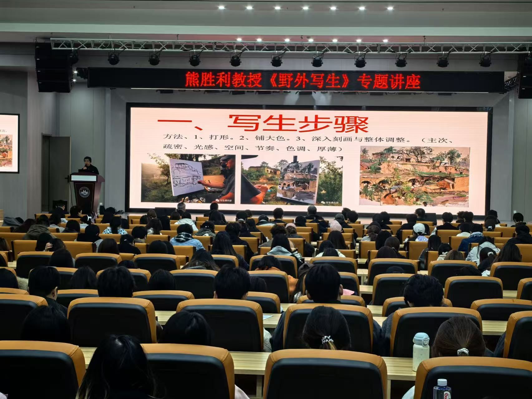 11月3日下午,熊胜利教授受邀在湖北工程学院汤文选美术馆一楼学术报告厅为我院即将进行《写生与采风》实践教学课程的2024级师生350余人作了题为“野外写生”的专题讲座报告。杨剑君院长出席。讲座由我院副院长、教授、陈军博士主持。